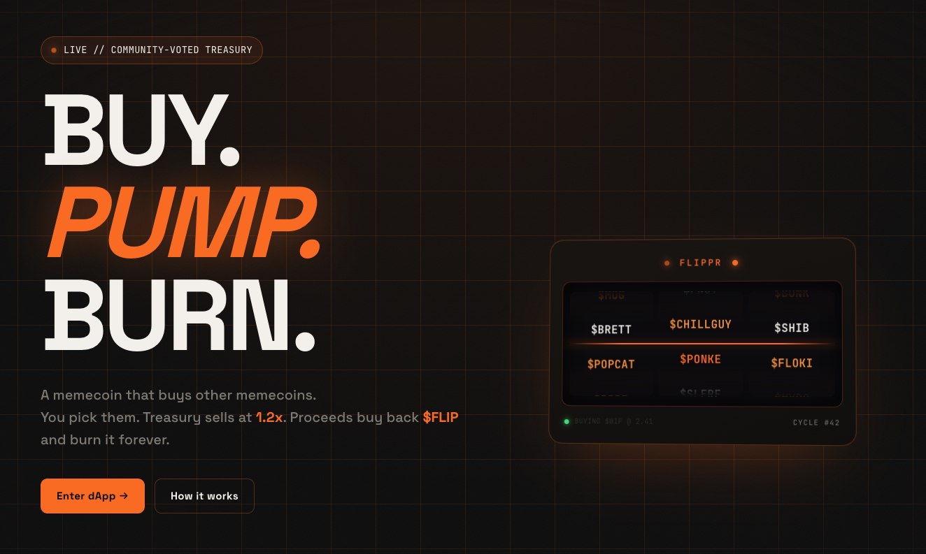 An on-chain protocol with a treasury that buys memecoins the community votes on, sells them at 20% profit, and uses the money to buy back and burn $FLIP. Loop never stops.